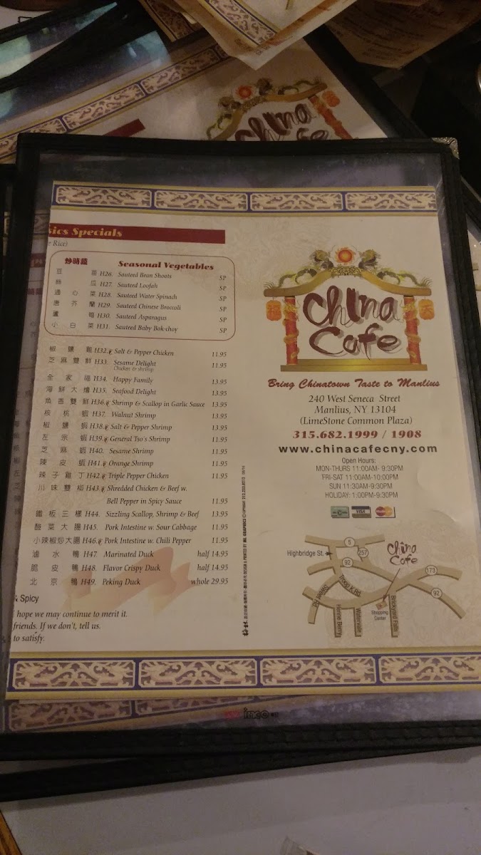 From a reviewer’s perspective, the menu at China Cafe offers a broad and well-rounded snapshot of classic Chinese-American dining, bringing together familiarity, variety, and comfort in one cohesive lineup. As a conclusion to the menu experience, what stands out most is the balance between hearty staples and more refined specialties. The Dinner Combo Platter section highlights crowd-pleasing options like Vegetable Chow Mein, Chicken Chow Mein, Pork Chow Mein, Beef Chow Mein, and Shrimp Chow Mein, making it easy for diners to enjoy a complete, satisfying meal. The Chinese Classic Special category adds depth with traditional and bold dishes such as Pork Meat Soup Dumpling (8), Szechuan Twice Cooked Pork, Braised Pork W Pickled Cabbage, Tri-Flavor Chicken, and South-Eastern Asian Seafood Casserole, which reflect more authentic regional flavors.